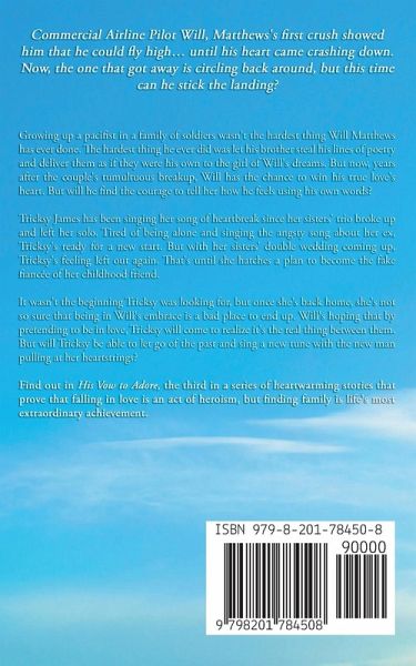 Commercial Airline Pilot Will, Matthews's first crush showed him that he could fly high… until his heart came crashing down. Now, the one that got away is circling back around, but this time can he stick the landing? Growing up a pacifist in a family of soldiers wasn't the hardest thing Will Matthews has ever done. The hardest thing he ever did was let his brother steal his lines of poetry and deliver them as if they were his own to the girl of Will's dreams. But now, years after the couple's tumultuous breakup, Will has the chance to win his true love's heart. But will he find the courage to tell her how he feels using his own words? Tricksy James has been singing her song of heartbreak since her sisters' trio broke up and left her solo. Tired of being alone and singing the angsty song about her ex, Tricksy's ready for a new start. But with her sisters' double wedding coming up, Tricksy's feeling left out again. That's until she hatches a plan to become the fake fiancée of her childhood friend. It wasn't the beginning Tricksy was looking for, but once she's back home, she's not so sure that being in Will's embrace is a bad place to end up. Will's hoping that by pretending to be in love, Tricksy will come to realize it's the real thing between them. But will Tricksy be able to let go of the past and sing a new tune with the new man pulling at her heartstrings? Find out in His Vow to Adore, the third in a series of heartwarming stories that prove that falling in love is an act of heroism, but finding family is life's most extraordinary achievement.