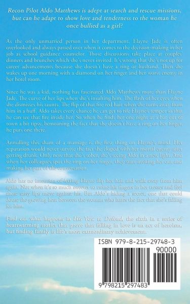 Recon Pilot Aldo Matthews is adept at search and rescue missions, but can he adapt to show love and tenderness to the woman he once bullied as a girl? As the only unmarried person in her department, Elayne Jade is often overlooked and always passed over when it comes to the decision-making in her job as school guidance counselor. Those discussions take place at couples' dinners and brunches which she's never invited. It's wrong that she's not up for career advancements because she doesn't have a ring or husband. Then she wakes up one morning with a diamond on her finger and her worst enemy in her hotel room. Since he was a kid, nothing has fascinated Aldo Matthews more than Elayne Jade. The curve of her lips when she's insulting him. The flash of her eyes when she dismisses his taunts. The flip of that fire red hair when she turns away from him in a huff. Aldo takes every chance he can get to rile Elayne's temper so that he can see that fire inside her. So when he finds her one night at a bar out of town a bit tipsy, bemoaning the fact that she doesn't have a ring on her finger, he puts one there. Annulling this sham of a marriage is the first thing on Elayne's mind. Her reputation would never survive the fact she eloped with her mortal enemy after getting drunk. Only now that she's sober, she's seeing Aldo in a new light. And when her colleagues spot the ring on her finger, they start inviting her out and making her part of the conversation. Aldo has no intention of letting Elayne flip her hair and walk away from him again. Not when it's so much sweeter to twine his fingers in her tresses and feel those sassy lips move against his. But Aldo's hiding a secret, one that could douse the growing heat between the woman who hates the fact that she's falling for him. Find out what happens in His Vow to Defend, the sixth in a series of heartwarming stories that prove that falling in love is an act of heroism, but finding family is life's most extraordinary achievement.