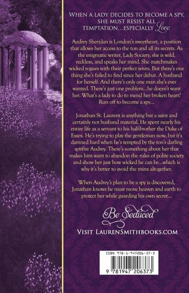 When a lady decides to become a spy, she must resist all temptation…especially love. Audrey Sheridan is London's sweetheart, a position that allows her access to the tonand all its secrets. As the enigmatic writer, Lady Society, she is wild, reckless, and speaks her mind. She matchmakes wicked rogues with their perfect wives. But there's one thing she's failed to find since her debut. A husband for herself. And there's only one man she's ever wanted. There's just one problem…he doesn't want her. What's a lady to do to mend her broken heart? Run off to become a spy… Jonathan St. Laurent is anything but a saint and certainly not husband material. He spent nearly his entire life as a servant to his half-brother the Duke of Essex. He's trying to play the gentleman now, but it's damned hard when he's tempted by the ton's darling spitfire Audrey. There's something about her that makes him want to abandon the rules of polite society and show her just how wicked he can be…which is why it's better to avoid the minx altogether. When Audrey's plan to be a spy is discovered, Jonathan knows he must move heaven and earth to protect her while guarding his own secret…