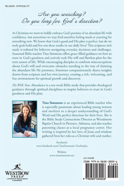 As Christians we want to boldly embrace God's promise of an abundant life with confidence, but sometimes we may find ourselves feeling stuck or yearning for something new. We know that God is good and His plan is perfect, but do we truly grab hold and live out these truths in our daily lives? This scripture-rich study is tailored for believers navigating everyday decisions and challenges. Seasoned Bible teacher Tina Simmons offers grace-filled guidance on how to trust in God's goodness and actively seek His will and flawless plan for the next season of life. While encouraging disciples to confront misconceptions about God's will and overcome obstacles standing in the way of claiming the abundant life He promises, Simmons compassionately shares insights drawn from scripture and her own journey, creating a rich, welcoming, and fun environment for spiritual growth and discovery. His Will: Your Abundance is a ten-week Bible study that provides theological guidance through spiritual disciplines to inspire believers to trust in God's goodness and His plan.