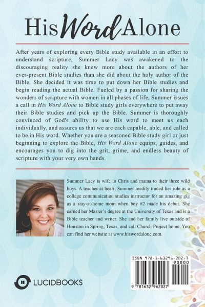 After years of exploring every Bible study available in an effort to understand scripture, Summer Lacy was awakened to the discouraging reality she knew more about the authors of her ever-present Bible studies than she did about the holy author of the Bible. She decided it was time to put down her Bible studies and begin reading the actual Bible. Fueled by a passion for sharing the wonders of scripture with women in all phases of life, Summer issues a call in His Word Alone to Bible study girls everywhere to put away their Bible studies and pick up the Bible. Summer is thoroughly convinced of God's ability to use His word to meet us each individually, and assures us that we are each capable, able, and called to be in His word. Whether you are a seasoned Bible study girl or just beginning to explore the Bible, His Word Alone equips, guides, and encourages you to dig into the grit, grime, and endless beauty of scripture with your very own hands.
