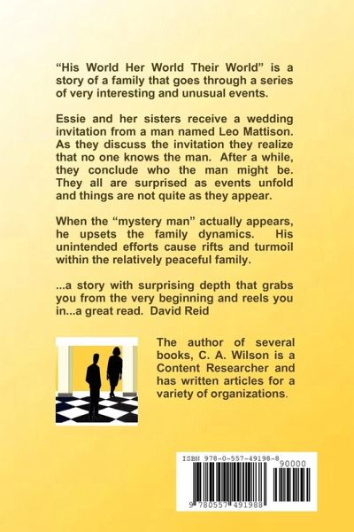 His World Her World Their World is an intriguing story of a family where a mystery man appears. Family members receive a wedding invitation from a man. After a while, they discover that no one knows the man. This modern day story unfolds in a city near New Orleans. As the family finds out, little by little, who the man might be, deeply buried family secrets are revealed and exposed and upsets the entire dynamics of the family causing rifts and turmoil within their relatively peaceful world. His World Her World Their World has surprising depth and grabs you from the beginning. It reels you in...a great read.