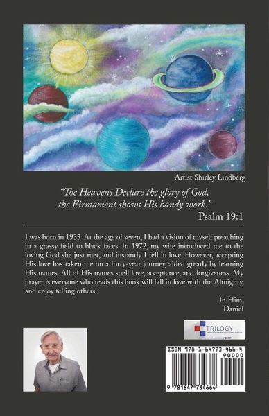 I was born in 1933. At the age of seven, I had a vision of myself preaching in a grassy field to black faces. In 1972, my wife introduced me to the loving God she just met, and instantly I fell in love. However, accepting His love has taken me on a forty-year journey, aided greatly by learning His names. All of His names spell love, acceptance, and forgiveness. My prayer is everyone who reads this book will fall in love with the Almighty, and enjoy telling others. In Him, Daniel