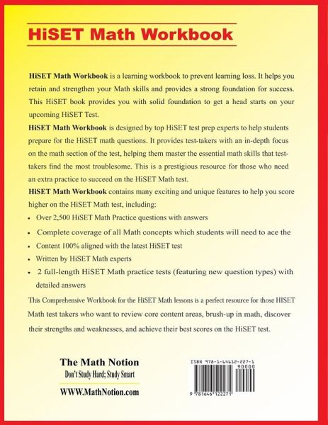 Prepare for The HiSET Math Test with a Perfect Workbook! HiSET Math Workbook is a learning workbook to prevent learning loss. It helps you retain and strengthen your Math skills and provides a strong foundation for success. This HiSET book provides you with solid foundation to get a head starts on your upcoming HiSET Test. HiSET Math Workbook is designed by top HiSET test prep experts to help students prepare for the HiSET math questions. It provides test-takers with an in-depth focus on the math section of the test, helping them master the essential math skills that test-takers find the most troublesome. This is a prestigious resource for those who need an extra practice to succeed on the HiSET Math test. HiSET Math Workbook contains many exciting and unique features to help you score higher on the HiSET Math test, including: * Over 2,500 HiSET Math Practice questions with answers * Complete coverage of all Math concepts which students will need to ace the HiSET test * Content 100% aligned with the latest HiSET test * Written by HiSET Math experts * 2 full-length HiSET Math practice tests (featuring new question types) with detailed answers This Comprehensive Workbook for the HiSET Math lessons is a perfect resource for those HiSET Math test takers who want to review core content areas, brush-up in math, discover their strengths and weaknesses, and achieve their best scores on the HiSET test. Published By: The Math Notion www.mathnotion.com