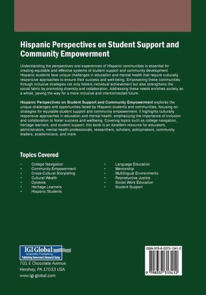 Understanding the perspectives and experiences of Hispanic communities is essential for creating equitable and effective systems of student support and community development. Hispanic students face unique challenges in education and mental health that require culturally responsive approaches to ensure their success and well-being. Empowering these communities through inclusive strategies not only fosters individual achievement but also strengthens the social fabric by promoting diversity and collaboration. Addressing these needs enriches society as a whole, paving the way for a more inclusive and interconnected future. Hispanic Perspectives on Student Support and Community Empowerment explores the unique challenges and opportunities faced by Hispanic students and communities, focusing on strategies for equitable student support and community empowerment. It highlights culturally responsive approaches in education and mental health, emphasizing the importance of inclusion and collaboration to foster success and wellbeing. Covering topics such as college navigation, heritage learners, and student support, this book is an excellent resource for educators, administrators, mental health professionals, researchers, scholars, policymakers, community leaders, academicians, and more.