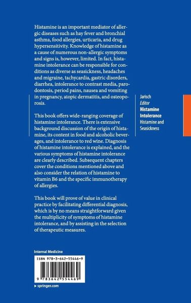Histamine is an important mediator of allergic diseases, but knowledge of histamine as a cause of numerous non-allergic symptoms and signs is limited. This book offers wide-ranging coverage of histamine intolerance. There is extensive background discussion of the origin of histamine, its content in food and alcoholic beverages and intolerance to red wine. Diagnosis of histamine intolerance is explained and the various symptoms of histamine intolerance are clearly described. Subsequent chapters cover the relation of histamine to a wide variety of conditions, including drug intolerance, atopic dermatitis, seasickness and osteoporosis. This book will prove of value in clinical practice by facilitating differential diagnosis, which is by no means straightforward given the multiplicity of symptoms of histamine intolerance and by assisting in the selection of therapeutic measures.