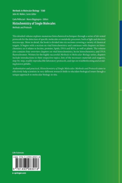 Single Cell Cytochemistry Illustrated by the Demonstration of Glucose-6-Phosphate Dehydrogenase Deficiency in Erythrocytes.- Autofluorescence Spectroscopy for Monitoring Metabolism in Animal Cells and Tissues.- Enzyme-Histochemistry Technique for Visualizing the Dipeptidyl-Peptidase IV (DPP-IV) Activity in the Liver Biliary Tree.- Histochemical Demonstration of Tripeptidyl Aminopeptidase I.- Enzyme Histochemistry for Functional Histology in Invertebrates.- Lectin Histochemistry: Historical Perspectives, State of the Art, and the Future.- Isolation of Viable Glycosylation-Specific Cell Populations for Further In Vitro or In Vivo Analysis Using Lectin-Coated Magnetic Beads.- Lectin Histochemistry for Metastasizing and Non-Metastasizing Cancer Cells.- The Use of Lectin Histochemistry for Detecting Apoptotic Cells in the Seminiferous Epithelium.- Heat-Induced Antigen Retrieval in Immunohistochemistry: Mechanisms and Applications.- Detecting Neuronal Differentiation Markers in Newborn Cells of the Adult Brain.- Characterizing Satellite Cells and Myogenic Progenitors During Skeletal Muscle Regeneration.- Immunohistochemical Detection of the Autophagy Markers LC3 and p62/SQSTM1 in Formalin Fixed and Paraffin Embedded Tissue.- Tissue Fixation and Processing for the Histological Identification of Lipids.- Staining Methods for Normal and Regenerative Myelin in the Nervous System.- Nile Red Staining of Neutral Lipids in Yeast.- Staining of Lipid Droplets with Monodansylpentane.- Fluorochromes for DNA Staining and Quantitation.- Osmium Ammine for Staining DNA at Electron Microscopy.- DNA Labeling at Electron Microscopy.- Visualizing RNA at Electron Microscopy by Terbium Citrate.- Two-Tailed Comet Assay (2T-Comet): Simultaneous Detection of DNA Single and Double Strand Breaks.- Detection of Endogenous Nuclear Proteins in Plant Cells: Localizing Nuclear Matrix Constituent Proteins (NMCPs), the Plant Analogues of Lamins.- Histochemical Analysis of Plant Secretory Structures.- A Histochemical Technique for the Detection of Annonaceous Acetogenins.
