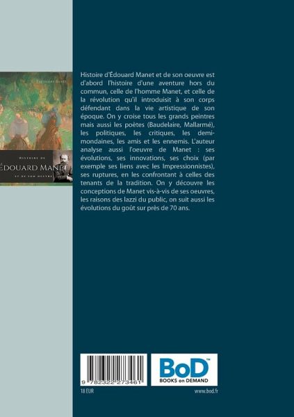 Histoire d'Édouard Manet et de son oeuvre est d'abord l'histoire d'une aventure hors du commun, celle de l'homme Manet, et celle de la révolution qu'il introduisit à son corps défendant dans la vie artistique de son époque. On y croise tous les grands peintres mais aussi les poètes (Baudelaire, Mallarmé), les politiques, les critiques, les demi-mondaines, les amis et les ennemis. L'auteur analyse aussi l'oeuvre de Manet : ses évolutions, ses innovations, ses choix (par exemple ses liens avec les Impressionnistes), ses ruptures, en les confrontant à celles des tenants de la tradition. On y découvre les conceptions de Manet vis-à-vis de ses oeuvres, les raisons des lazzi du public, on suit aussi les évolutions du goût sur près de 70 ans.
