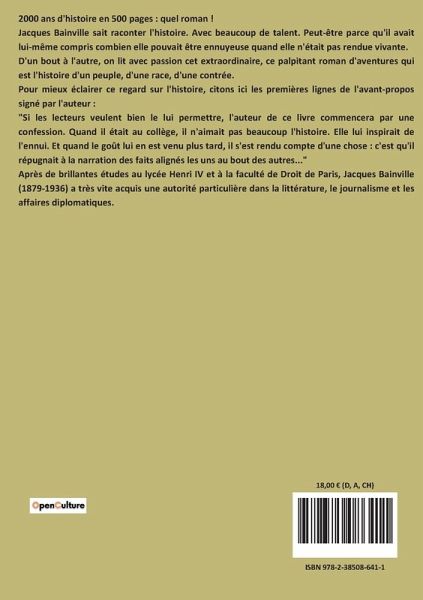 2000 ans d'histoire en 500 pages : quel roman ! Jacques Bainville sait raconter l'histoire. Avec beaucoup de talent. Peut-être parce qu'il avait lui-même compris combien elle pouvait être ennuyeuse quand elle n'était pas rendue vivante. D'un bout à l'autre, on lit avec passion cet extraordinaire, ce palpitant roman d'aventures qui est l'histoire d'un peuple, d'une race, d'une contrée. Pour mieux éclairer ce regard sur l'histoire, citons ici les premières lignes de l'avant-propos signé par l'auteur : "Si les lecteurs veulent bien le lui permettre, l'auteur de ce livre commencera par une confession. Quand il était au collège, il n'aimait pas beaucoup l'histoire. Elle lui inspirait de l'ennui. Et quand le goût lui en est venu plus tard, il s'est rendu compte d'une chose : c'est qu'il répugnait à la narration des faits alignés les uns au bout des autres..." Après de brillantes études au lycée Henri IV et à la faculté de Droit de Paris, Jacques Bainville (1879-1936) a très vite acquis une autorité particulière dans la littérature, le journalisme et les affaires diplomatiques.