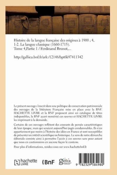 Histoire de la langue française des origines à 1900; 4, 1-2. La langue classique (1660-1715). Tome 4, Partie 1 / Ferdinand Brunot, ... Date de l'édition originale: 1913-1924 Le présent ouvrage s'inscrit dans une politique de conservation patrimoniale des ouvrages de la littérature Française mise en place avec la BNF. HACHETTE LIVRE et la BNF proposent ainsi un catalogue de titres indisponibles, la BNF ayant numérisé ces oeuvres et HACHETTE LIVRE les imprimant à la demande. Certains de ces ouvrages reflètent des courants de pensée caractéristiques de leur époque, mais qui seraient aujourd'hui jugés condamnables. Ils n'en appartiennent pas moins à l'histoire des idées en France et sont susceptibles de présenter un intérêt scientifique ou historique. Le sens de notre démarche éditoriale consiste ainsi à permettre l'accès à ces oeuvres sans pour autant que nous en cautionnions en aucune façon le contenu. Pour plus d'informations, rendez-vous sur www.hachettebnf.fr