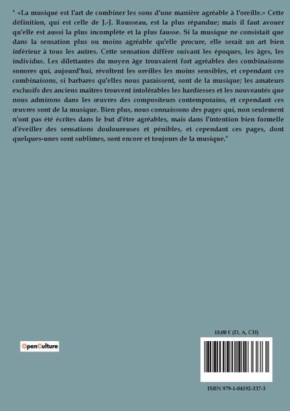 " «La musique est l'art de combiner les sons d'une manière agréable à l'oreille.» Cette définition, qui est celle de J.-J. Rousseau, est la plus répandue; mais il faut avouer qu'elle est aussi la plus incomplète et la plus fausse. Si la musique ne consistait que dans la sensation plus ou moins agréable qu'elle procure, elle serait un art bien inférieur à tous les autres. Cette sensation diffère suivant les époques, les âges, les individus. Les dilettantes du moyen âge trouvaient fort agréables des combinaisons sonores qui, aujourd'hui, révoltent les oreilles les moins sensibles, et cependant ces combinaisons, si barbares qu'elles nous paraissent, sont de la musique; les amateurs exclusifs des anciens maîtres trouvent intolérables les hardiesses et les nouveautés que nous admirons dans les ¿uvres des compositeurs contemporains, et cependant ces ¿uvres sont de la musique. Bien plus, nous connaissons des pages qui, non seulement n'ont pas été écrites dans le but d'être agréables, mais dans l'intention bien formelle d'éveiller des sensations douloureuses et pénibles, et cependant ces pages, dont quelques-unes sont sublimes, sont encore et toujours de la musique."