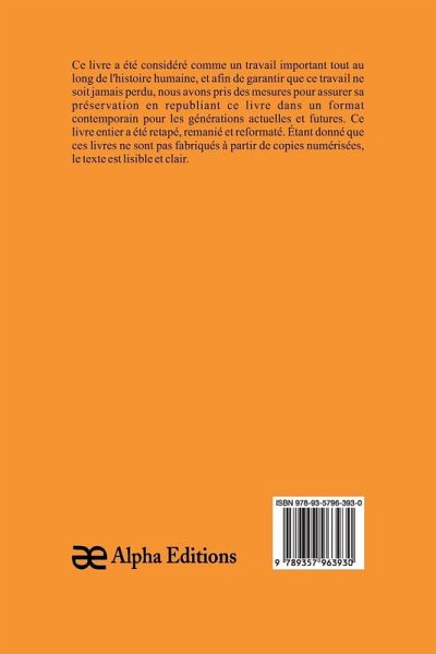 Histoire de la musique, un livre classique, a été considéré comme important tout au long de l'histoire de l'humanité, et pour que cet ouvrage ne soit jamais oublié, chez Alpha Editions, nous avons fait des efforts pour sa préservation en rééditant ce livre dans un format moderne pour les générations présentes et futures. Tout ce livre a été reformaté, retapé et conçu. Ces livres ne sont pas constitués de copies numérisées de leur ¿uvre originale et le texte est donc clair et lisible.