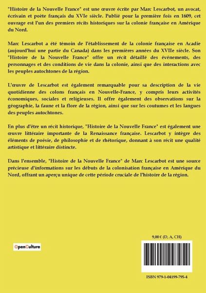 "Histoire de la Nouvelle France" est une ¿uvre écrite par Marc Lescarbot, un avocat, écrivain et poète français du XVIe siècle. Publié pour la première fois en 1609, cet ouvrage est l'un des premiers récits historiques sur la colonie française en Amérique du Nord. Marc Lescarbot a été témoin de l'établissement de la colonie française en Acadie (aujourd'hui une partie du Canada) dans les premières années du XVIIe siècle. Son "Histoire de la Nouvelle France" offre un récit détaillé des événements, des personnages et des conditions de vie dans la colonie, ainsi que des interactions avec les peuples autochtones de la région. L'¿uvre de Lescarbot est également remarquable pour sa description de la vie quotidienne des colons français en Nouvelle-France, y compris leurs activités économiques, sociales et religieuses. Il offre également des observations sur la géographie, la faune et la flore de la région, ainsi que sur les coutumes et les langues des peuples autochtones. En plus d'être un récit historique, "Histoire de la Nouvelle France" est également une ¿uvre littéraire importante de la Renaissance française. Lescarbot y intègre des éléments de poésie, de philosophie et de rhétorique, donnant à son récit une qualité artistique et littéraire distincte. Dans l'ensemble, "Histoire de la Nouvelle France" de Marc Lescarbot est une source précieuse d'informations sur les débuts de la colonisation française en Amérique du Nord, offrant un aperçu unique de cette période cruciale de l'histoire de la région.