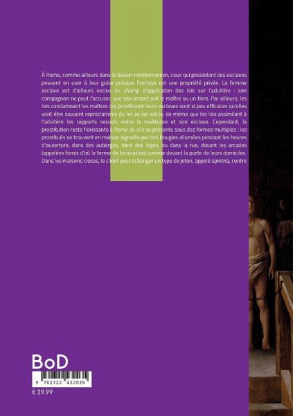 À Rome, comme ailleurs dans le bassin méditerranéen, ceux qui possèdent des esclaves peuvent en user à leur guise puisque l'esclave est une propriété privée. La femme esclave est d'ailleurs exclue du champ d'application des lois sur l'adultère : son compagnon ne peut l'accuser, que son amant soit le maître ou un tiers. Par ailleurs, les lois condamnant les maîtres qui prostituent leurs esclaves sont si peu efficaces qu'elles vont être souvent reproclamées du Ier au ive siècle, de même que les lois assimilant à l'adultère les rapports sexuels entre la maîtresse et son esclave. Cependant, la prostitution reste florissante à Rome où elle se présente sous des formes multiples : les prostitués se trouvent en maison signalée par des bougies allumées pendant les heures d'ouverture, dans des auberges, dans des loges, ou dans la rue, devant les arcades (appelées fornix d'où le terme de fornication) comme devant la porte de leurs domiciles. Dans les maisons closes, le client peut échanger un type de jeton, appelé spintria, contre une faveur sexuelle spécifique. Très tôt, dès le IIe siècle av. J.-C., les prostitués sont inscrits sur un registre spécial et doivent être munis d'une licence d'exercice. Civilement, ils sont frappés d'indignité. Leur condition varie, des plus miséreuses, esclaves, aux courtisans et courtisanes de luxe dont les services se monnaient très cher. Les réseaux sont alimentés par le trafic d'esclaves alimenté par les guerres et la piraterie : à Délos, 10 000 esclaves sont vendus chaque jour, et dans l'empire ce sont des dizaines de milliers d'enfants et d'adolescents qui approvisionnent chaque année ce marché de la prostitution.