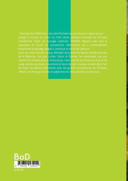 Jules Michelet (1798-1874) est l'un des historiens français les plus influents et novateurs du XIXe siècle. Né dans une famille modeste à Paris, il gravit les échelons académiques grâce à son intelligence exceptionnelle et sa passion pour l'histoire. Nommé professeur à l'École normale supérieure en 1827, puis titulaire de la chaire d'histoire et de morale au Collège de France en 1838, Michelet révolutionne l'approche de l'histoire. Il développe une méthode unique, mêlant rigueur scientifique et sensibilité littéraire, qui vise à « ressusciter » le passé plutôt que simplement le décrire. Son oeuvre maîtresse, l'« Histoire de France », dont l'« Histoire de la Réforme » fait partie, témoigne de cette approche novatrice. Michelet y déploie tout son talent pour faire revivre les époques passées, donnant chair et âme aux personnages historiques et aux mouvements sociaux. Fervent républicain et anticlérical, Michelet voit dans la Réforme protestante une étape cruciale vers l'émancipation de l'esprit humain. Son intérêt pour cette période s'inscrit dans sa vision plus large de l'histoire comme un processus de libération progressive du peuple. Michelet est aussi l'un des premiers représentants de l'historicisme en France, considérant que les idées et les valeurs d'une société sont intrinsèquement liées à son contexte historique. Cette approche transparaît clairement dans son traitement de la Réforme, qu'il analyse en lien étroit avec les bouleversements intellectuels et sociaux de la Renaissance. L'influence de Michelet dépasse largement le cadre de l'historiographie. Son style vivant et poétique, sa capacité à rendre l'histoire accessible et passionnante pour un large public, ont inspiré de nombreux écrivains et penseurs. Son « Histoire de la Réforme » reste un ouvrage de référence, tant pour sa richesse factuelle que pour la puissance évocatrice de son récit.