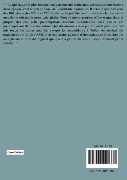 " Ce qui frappe le plus lorsque l'on parcourt une traduction quelconque antérieure à notre époque, c'est le peu de souci de l'exactitude rigoureuse. Il semble que, aux yeux des littérateurs des XVIIe et XVIIIe siècles, la parfaite conformité entre la copie et le modèle ne soit pas la principale affaire. Tout au moins peut-on affirmer que, dans la plupart des cas, cette préoccupation demeure subordonnée chez eux à des préoccupations d'une autre nature. Que dirions-nous d'un portrait où le peintre aurait mis toutes les autres qualités, excepté la ressemblance ? Telles, en général, les traductions des XVIIe etXVIII e siècles. Moins jalouses d'être vraies que de se faire lire avec plaisir, elles se distinguent quelquefois par les mérites du style, rarement par la fidélité...."