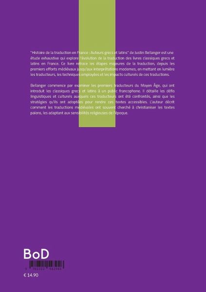 "Histoire de la traduction en France : Auteurs grecs et latins" de Justin Bellanger est une étude exhaustive qui explore l'évolution de la traduction des livres classiques grecs et latins en France. Ce livre retrace les étapes majeures de la traduction, depuis les premiers efforts médiévaux jusqu'aux interprétations modernes, en mettant en lumière les traducteurs, les techniques employées et les impacts culturels de ces traductions. Bellanger commence par examiner les premiers traducteurs du Moyen Âge, qui ont introduit les classiques grecs et latins à un public francophone. Il détaille les défis linguistiques et culturels auxquels ces traducteurs ont été confrontés, ainsi que les stratégies qu'ils ont adoptées pour rendre ces textes accessibles. L'auteur décrit comment les traductions médiévales ont souvent cherché à christianiser les textes païens, les adaptant aux sensibilités religieuses de l'époque. Le livre explore ensuite la Renaissance, une période de renouveau pour la traduction des auteurs classiques. Bellanger analyse le rôle des humanistes français qui, inspirés par le retour aux sources antiques, ont produit des traductions plus fidèles et littéraires des oeuvres de Platon, Aristote, Cicéron, et Virgile, entre autres. Il met en lumière les figures clés de cette période, comme Étienne Dolet et Jacques Amyot, et examine leurs contributions à la traduction. Bellanger continue avec l'ère des Lumières, où les traductions des classiques grecs et latins ont été influencées par les idées de rationalité et de progrès. Il décrit comment les traducteurs de cette époque, tels que André Dacier et Anne Dacier, ont cherché à rendre les textes antiques compréhensibles et pertinents pour les lecteurs modernes, tout en respectant leur originalité. Le livre aborde également le XIXe siècle, une période marquée par une plus grande diversité dans les approches de traduction. Bellanger analyse les traductions de cette époque sous l'influence du romantisme, avec un accent sur l'expression personnelle et la fidélité à l'esprit des textes originaux. Il discute des travaux de traducteurs tels que Charles Leconte de Lisle et leur impact sur la réception des classiques en France. En conclusion, Bellanger examine les tendances contemporaines dans la traduction des auteurs grecs et latins, en mettant en avant les défis actuels et les nouvelles méthodologies adoptées par les traducteurs modernes. "Histoire de la traduction en France : Auteurs grecs et latins" est une