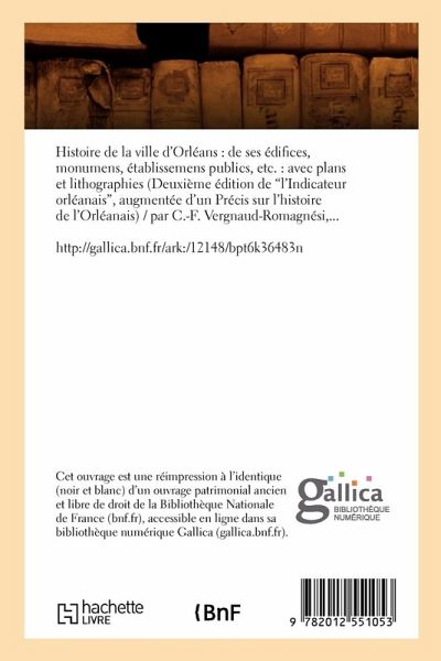 Histoire de la ville d'Orleans: de ses edifices, monumens, etablissemens publics, etc.: avec plans et lithographies (Deuxieme edition de l'Indicateur orleanais," augmentee d'un Precis sur l'histoire de l'Orleanais) / par C.-F. Vergnaud-Romagnesi, ...Date de l'edition originale: 1830Sujet de l'ouvrage: Orleans (Loiret) -- HistoireCe livre est la reproduction fidele d'une oeuvre publiee avant 1920 et fait partie d'une collection de livres reimprimes a la demande editee par Hachette Livre, dans le cadre d'un partenariat avec la Bibliotheque nationale de France, offrant l'opportunite d'acceder a des ouvrages anciens et souvent rares issus des fonds patrimoniaux de la BnF.Les oeuvres faisant partie de cette collection ont ete numerisees par la BnF et sont presentes sur Gallica, sa bibliotheque numerique.En entreprenant de redonner vie a ces ouvrages au travers d'une collection de livres reimprimes a la demande, nous leur donnons la possibilite de rencontrer un public elargi et participons a la transmission de connaissances et de savoirs parfois difficilement accessibles.Nous avons cherche a concilier la reproduction fidele d'un livre ancien a partir de sa version numerisee avec le souci d'un confort de lecture optimal. Nous esperons que les ouvrages de cette nouvelle collection vous apporteront entiere satisfaction.Pour plus d'informations, rendez-vous sur www.hachettebnf.frhttp: //gallica.bnf.fr/ark: /12148/bpt6k36483n"