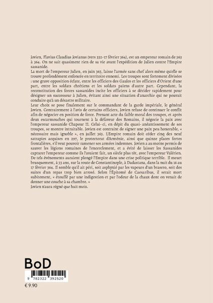 Jovien, Flavius Claudius Jovianus (vers 332-17 février 364), est un empereur romain de 363 à 364. On ne sait quasiment rien de sa vie avant l'expédition de Julien contre l'Empire sassanide.La mort de l'empereur Julien, en juin 363, laisse l'armée sans chef alors même qu'elle se trouve profondément enfoncée en territoire ennemi. Les troupes sont fortement divisées : une grave opposition éclate, entre les officiers des Gaules et les officiers d'Orient d'une part, entre les soldats chrétiens et les soldats païens d'autre part. Cependant, la reconstitution des forces sassanides incite les officiers à se décider rapidement pour désigner un successeur à Julien, évitant ainsi une situation d'anarchie qui ne pouvait conduire qu'à un désastre militaire.Leur choix se pose finalement sur le commandant de la garde impériale, le général Jovien. Contrairement à l'avis de certains officiers, Jovien refuse de continuer le conflit afin de négocier en position de force. Prenant acte du faible moral des troupes, et après deux escarmouches qui tournent à la défaveur des Romains, il négocie la paix avec l'empereur sassanide Chapour II. Celui-ci, en dépit du quasi-anéantissement de ses troupes, se montre intraitable. Jovien est contraint de signer une paix peu honorable, « nécessaire mais ignoble », en juillet 363. L'Empire romain doit céder cinq des neuf satrapies acquises en 297, le protectorat d'Arménie, ainsi que quinze places fortes frontalières, s'il veut pouvoir ramener ses armées indemnes. Jovien a au moins permis de sauver les légions romaines de l'encerclement, et a évité de laisser les Sassanides capturer l'empereur comme ils l'avaient fait, un siècle plus tôt, avec l'empereur Valérien. De tels événements auraient plongé l'Empire dans une crise politique terrible. Il meurt brusquement, à 33 ans, sur la route de Constantinople, à Dadastana, dans la nuit du 16 au 17 février 364. Il semble qu'il ait péri, soit asphyxié par les vapeurs d'un brasero, soit des suites d'un repas trop bien arrosé. Selon l'Épitomé de Caesaribus, il serait mort subitement, « étouffé par une indigestion et par l'odeur de la chaux dont on venait de donner une couche à sa chambre. »Jovien n'aura régné que huit mois.
