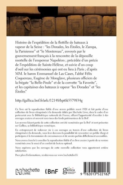 Histoire de l'expédition de la flottille de bateaux à vapeur de la Seine: "les Dorades, les Étoiles, le Zampa, la Parisienne" et "le Montereau", envoyés par le gouvernement français à la rencontre de la dépouille mortelle de l'empereur Napoléon; précédée d'un précis de l'expédition de Sainte-Hélène, et suivie d'un coup d'oeil sur les cérémonies qui ont eu lieu à Paris; d'après MM. le baron Emmanuel de Las Cases, l'abbé Félix Coquereau, Eugène de Monglave, plusieurs officiers de la frégate "la Belle-Poule" et de la corvette "la Favorite", et les capitaines des bateaux à vapeur "les Dorades" et "les Étoiles" Date de l'édition originale: 1841 Sujet de l'ouvrage: France (1830-1848, Louis-Philippe) Le présent ouvrage s'inscrit dans une politique de conservation patrimoniale des ouvrages de la littérature Française mise en place avec la BNF. HACHETTE LIVRE et la BNF proposent ainsi un catalogue de titres indisponibles, la BNF ayant numérisé ces oeuvres et HACHETTE LIVRE les imprimant à la demande. Certains de ces ouvrages reflètent des courants de pensée caractéristiques de leur époque, mais qui seraient aujourd'hui jugés condamnables. Ils n'en appartiennent pas moins à l'histoire des idées en France et sont susceptibles de présenter un intérêt scientifique ou historique. Le sens de notre démarche éditoriale consiste ainsi à permettre l'accès à ces oeuvres sans pour autant que nous en cautionnions en aucune façon le contenu. Pour plus d'informations, rendez-vous sur www.hachettebnf.fr