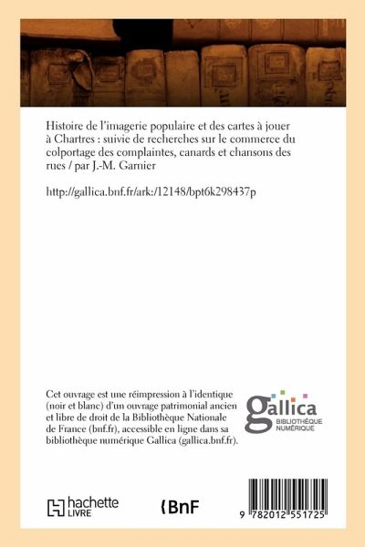Histoire de l'imagerie populaire et des cartes a jouer a Chartres: suivie de recherches sur le commerce du colportage des complaintes, canards et chansons des rues / par J.-M. GarnierDate de l'edition originale: 1869Sujet de l'ouvrage: Imagerie populaire -- France -- Chartres (Eure-et-Loir)Cartes a jouer -- Industrie et commerce -- France -- Chartres (Eure-et-Loir)Musiciens ambulants -- France (18e siecleHistoire et critiqueCe livre est la reproduction fidele d'une oeuvre publiee avant 1920 et fait partie d'une collection de livres reimprimes a la demande editee par Hachette Livre, dans le cadre d'un partenariat avec la Bibliotheque nationale de France, offrant l'opportunite d'acceder a des ouvrages anciens et souvent rares issus des fonds patrimoniaux de la BnF.Les oeuvres faisant partie de cette collection ont ete numerisees par la BnF et sont presentes sur Gallica, sa bibliotheque numerique.En entreprenant de redonner vie a ces ouvrages au travers d'une collection de livres reimprimes a la demande, nous leur donnons la possibilite de rencontrer un public elargi et participons a la transmission de connaissances et de savoirs parfois difficilement accessibles.Nous avons cherche a concilier la reproduction fidele d'un livre ancien a partir de sa version numerisee avec le souci d'un confort de lecture optimal. Nous esperons que les ouvrages de cette nouvelle collection vous apporteront entiere satisfaction.Pour plus d'informations, rendez-vous sur www.hachettebnf.frhttp: //gallica.bnf.fr/ark: /12148/bpt6k298437p