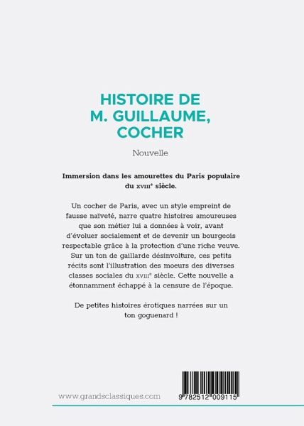 Immersion dans les amourettes du Paris populaire du XVIIIe siècle POUR UN PUBLIC AVERTI. Un cocher de Paris, avec un style empreint de fausse naïveté, narre quatre histoires amoureuses que son métier lui a données à voir, avant d'évoluer socialement et de devenir un bourgeois respectable grâce à la protection d'une riche veuve. Sur un ton de gaillarde désinvolture, ces petits récits sont l'illustration des moeurs des diverses classes sociales du XVIIIe siècle. Cette nouvelle a étonnamment échappé à la censure de l'époque. De petites histoires érotiques narrées sur un ton goguenard ! EXTRAIT Préface ¿ M. Guillaume au public. Monsieur le public, vous allez être bien étonné de ce qüun homme de mon acabit prend la plume en main, pour vous faire participant de bien des drôleries qüil a vu sur le pavé de Paris, où il peut dire, sans vanité, qüil a roulé autant qüun homme du monde qüil y ait. Quoique je sois, à cette heure, un bon bourgeois d¿auprès de Paris, cela n¿empêche pas que je ne me souvienne toujours bien, que j¿ai été cocher de place, après de remise, ensuite j¿ai mené un petit-maître que j¿ai planté là pour les chevaux d¿une brave dame, qui m¿a fait ce que je suis au jour d¿aujourd¿hui. [...] Premièrement, d¿abord et d¿un ; je commencerai par l¿histoire de mamselle Godiche, qui lui est arrivée dans le temps que j¿étais à la rue Mazarine, à la Glacière, à Chaillot, avec le fils d¿un marchand de l¿apport-Paris. Par après, je vous lâcherai l¿affaire de la femme de ce notaire avec un gros commis de la douane, à la foire Saint-Laurent, quand j¿étais remisier. Pour ce qui est de la troisième, ce sera l¿histoire de M. le Chevalier Brillantin, qui ne m¿a jamais payé mes gages qüà coups de plat d¿épée, pendant que j¿ai mené sa diligence. Et enfin finale, vous aurez celle de Mme Allain, ma bonne maîtresse, qui m¿a laissé de quoi vivre, avec M. l¿abbé Évrard, duquel elle vit son bec-jaune, comme vous le verrez vous-même à la fin du présent livre. Par ainsi, ça fera quatre aventures d¿amourettes. À PROPOS DE L'AUTEUR Anne-Claude-Philippe de Tubières, dit Comte de Caylus (1692-1765) est un archéologue, antiquaire, homme de lettres et graveur français. Voyageur et collectionneur d'antiquités, on lui doit de nombreux ouvrages d'archéologie ainsi que les premières bases de la méthode comparative en la matière. Il est l'auteur de nombreuses nouvelles érotiques, parmi lesquels Histoire de Mr. Guillaume, cocher et Voluptueux Hors de Combat, incluses dans les ¿uvres badines complètes (1757), mais aussi de contes de fées : Les Féeries nouvelles (1741), Les Contes orientaux (1745) ou Cinq contes de fées (1745). À PROPOS DE LA COLLECTION Retrouvez les plus grands noms de la littérature érotique dans notre collection Grands classiques érotiques. Autrefois poussés à la clandestinité et relégués dans « l'Enfer des bibliothèques », les auteurs de ces ¿uvres incontournables du genre sont aujourd'hui reconnus mondialement. Du Marquis de Sade à Alphonse Momas et ses multiples pseudonymes, en passant par le lyrique Alfred de Musset ou la féministe Renée Dunan, les Grands classiques érotiques proposent un catalogue complet et varié qui contentera tant les novices que les connaisseurs.