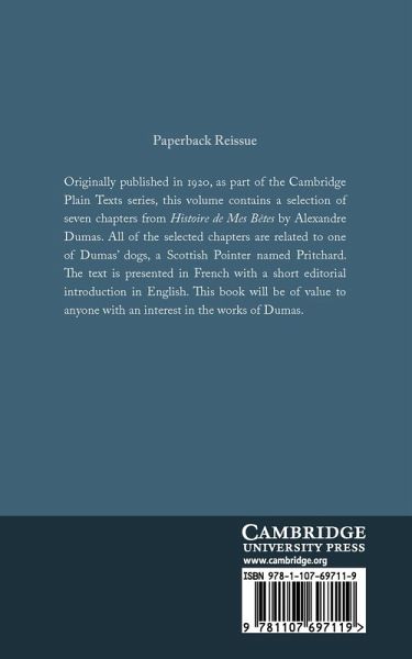 Originally published in 1920 as part of the Cambridge Plain Texts series, this volume contains a selection of seven chapters from Histoire de mes bêtes by Alexandre Dumas. All of the selected chapters are related to one of Dumas' dogs, a Scottish Pointer named Pritchard. The text is presented in French with a short editorial introduction in English. This book will be of value to anyone with an interest in the works of Dumas.