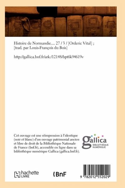Histoire de Normandie.... 27 / 3 / [Orderic Vital]; [trad. par Louis-Francois du Bois]Date de l'edition originale: 1825-1827Sujet de l'ouvrage: Normandie (France) -- HistoireTitre original: Historia ecclesiasticaCollection: Collection des memoires relatifs a l'histoire de France; XXV-XXVIIICe livre est la reproduction fidele d'une oeuvre publiee avant 1920 et fait partie d'une collection de livres reimprimes a la demande editee par Hachette Livre, dans le cadre d'un partenariat avec la Bibliotheque nationale de France, offrant l'opportunite d'acceder a des ouvrages anciens et souvent rares issus des fonds patrimoniaux de la BnF.Les oeuvres faisant partie de cette collection ont ete numerisees par la BnF et sont presentes sur Gallica, sa bibliotheque numerique.En entreprenant de redonner vie a ces ouvrages au travers d'une collection de livres reimprimes a la demande, nous leur donnons la possibilite de rencontrer un public elargi et participons a la transmission de connaissances et de savoirs parfois difficilement accessibles.Nous avons cherche a concilier la reproduction fidele d'un livre ancien a partir de sa version numerisee avec le souci d'un confort de lecture optimal. Nous esperons que les ouvrages de cette nouvelle collection vous apporteront entiere satisfaction.Pour plus d'informations, rendez-vous sur www.hachettebnf.frhttp: //gallica.bnf.fr/ark: /12148/bpt6k94619v