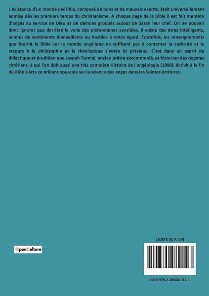 L'existence d'un monde invisible, composé de bons et de mauvais esprits, était universellement admise dès les premiers temps du christianisme. A chaque page de la Bible il est fait mention d'anges au service de Dieu et de démons groupés autour de Satan leur chef. On ne pouvait donc ignorer que derrière le voile des phénomènes sensibles, il existe des êtres intelligents, animés de sentiments bienveillants ou hostiles à notre égard. Toutefois, les renseignements que fournit la Bible sur le monde angélique ne suffisent pas à contenter la curiosité et le recours à la philosophie et la théologique s'avère ici précieux. C'est dans un esprit de didactique et érudition que Joseph Turmel, ancien prêtre excommunié, et historien des dogmes chrétiens, à qui l'on doit aussi une très complète Histoire de l'angéologie (1898), écrivit à la fin du XIXe siècle ce brillant opuscule sur la science des anges dans les Saintes écritures.