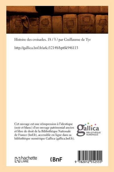 Histoire des croisades. 18 / 3 / par Guillaume de Tyr Date de l'édition originale: 1824 Sujet de l'ouvrage: Croisades -- Histoire Collection: Collection de mémoires relatifs à l'histoire de France; 16-18 Le présent ouvrage s'inscrit dans une politique de conservation patrimoniale des ouvrages de la littérature Française mise en place avec la BNF. HACHETTE LIVRE et la BNF proposent ainsi un catalogue de titres indisponibles, la BNF ayant numérisé ces oeuvres et HACHETTE LIVRE les imprimant à la demande. Certains de ces ouvrages reflètent des courants de pensée caractéristiques de leur époque, mais qui seraient aujourd'hui jugés condamnables. Ils n'en appartiennent pas moins à l'histoire des idées en France et sont susceptibles de présenter un intérêt scientifique ou historique. Le sens de notre démarche éditoriale consiste ainsi à permettre l'accès à ces oeuvres sans pour autant que nous en cautionnions en aucune façon le contenu. Pour plus d'informations, rendez-vous sur www.hachettebnf.fr