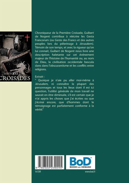 Chroniqueur de la Première Croisade, Guibert de Nogent contribua à réécrire les Gesta Francorum (ou Geste des Francs et des autres peuples lors du pèlerinage à Jérusalem). Témoin de son temps, et avec la rigueur qu'on lui connait, Guibert de Nogent nous livre une description haletante sur cet événement majeur de l'histoire de l'humanité ou, au nom de Dieu, la civilisation occidentale bascula dans dans l'obscurantisme et les conflits entre religions.