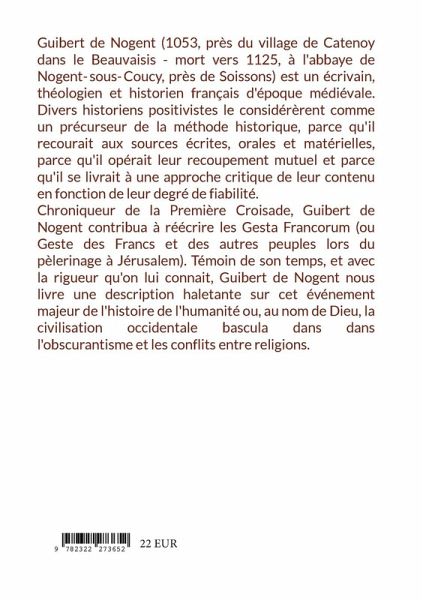 Guibert de Nogent (1053, près du village de Catenoy dans le Beauvaisis - mort vers 1125, à l'abbaye de Nogent-sous-Coucy, près de Soissons) est un écrivain, théologien et historien français d'époque médiévale. Divers historiens positivistes le considérèrent comme un précurseur de la méthode historique, parce qu'il recourait aux sources écrites, orales et matérielles, parce qu'il opérait leur recoupement mutuel et parce qu'il se livrait à une approche critique de leur contenu en fonction de leur degré de fiabilité.Chroniqueur de la Première Croisade, Guibert de Nogent contribua à réécrire les Gesta Francorum (ou Geste des Francs et des autres peuples lors du pèlerinage à Jérusalem). Témoin de son temps, et avec la rigueur qu'on lui connait, Guibert de Nogent nous livre une description haletante sur cet événement majeur de l'histoire de l'humanité ou, au nom de Dieu, la civilisation occidentale bascula dans dans l'obscurantisme et les conflits entre religions.