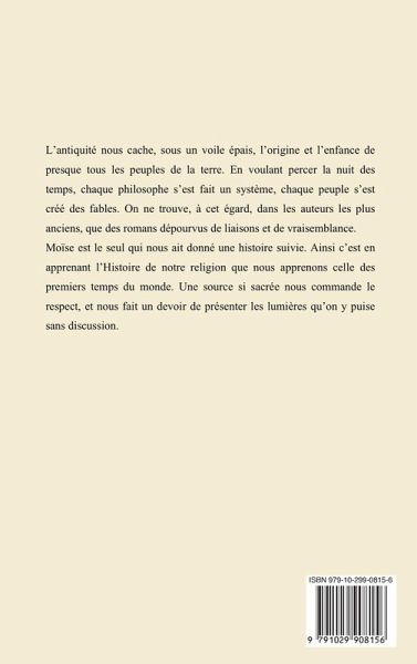L’antiquité nous cache, sous un voile épais, l’origine et l’enfance de presque tous les peuples de la terre. En voulant percer la nuit des temps, chaque philosophe s’est fait un système, chaque peuple s’est créé des fables. On ne trouve, à cet égard, dans les auteurs les plus anciens, que des romans dépourvus de liaisons et de vraisemblance. Moïse est le seul qui nous ait donné une histoire suivie. Ainsi c’est en apprenant l’Histoire de notre religion que nous apprenons celle des premiers temps du monde. Une source si sacrée nous commande le respect, et nous fait un devoir de présenter les lumières qu’on y puise sans discussion.