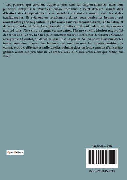 " Les peintres qui devaient s¿appeler plus tard les Impressionnistes, dans leur jeunesse, lorsqüils se trouvaient encore inconnus, à l¿état d¿élèves, étaient déjà d¿instinct des indépendants, ils se sentaient entraînés à rompre avec les règles traditionnelles. Ils s¿étaient en conséquence donné pour guides les hommes, qui avaient alors porté la peinture le plus avant dans l¿observation directe de la nature et de la vie, Courbet et Corot. Ce sont ces deux maîtres qüils ont d¿abord suivis, chacun à part soi, sans s¿être encore connus ou rencontrés. Pissarro et Mlle Morisot ont profité des conseils de Corot, Renoir a peint un. moment sous l¿influence de Courbet, Cézanne a emprunté à Courbet, au début, sa tonalité et sa palette. Si l¿on pouvait rassembler les toutes premières ¿uvres des hommes qui sont devenus les Impressionnistes, on verrait, avec des différences individuelles pointant déjà, un fond commun d¿une même gamme, allant des procédés de Courbet à ceux de Corot. C¿est alors que Manet sur vint."