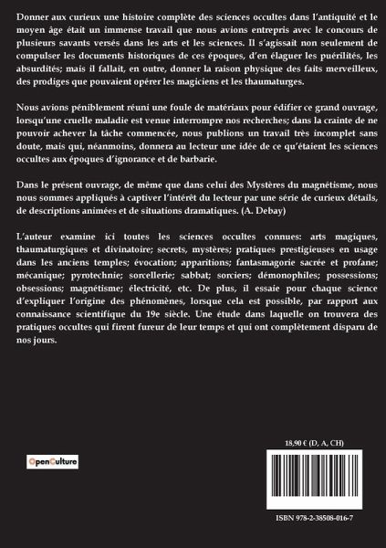 Donner aux curieux une histoire complète des sciences occultes dans l¿antiquité et le moyen âge était un immense travail que nous avions entrepris avec le concours de plusieurs savants versés dans les arts et les sciences. Il s¿agissait non seulement de compulser les documents historiques de ces époques, d¿en élaguer les puérilités, les absurdités; mais il fallait, en outre, donner la raison physique des faits merveilleux, des prodiges que pouvaient opérer les magiciens et les thaumaturges. Nous avions péniblement réuni une foule de matériaux pour édifier ce grand ouvrage, lorsqüune cruelle maladie est venue interrompre nos recherches; dans la crainte de ne pouvoir achever la tâche commencée, nous publions un travail très incomplet sans doute, mais qui, néanmoins, donnera au lecteur une idée de ce qüétaient les sciences occultes aux époques d¿ignorance et de barbarie. Dans le présent ouvrage, de même que dans celui des Mystères du magnétisme, nous nous sommes appliqués à captiver l¿intérêt du lecteur par une série de curieux détails, de descriptions animées et de situations dramatiques. (A. Debay) L¿auteur examine ici toutes les sciences occultes connues: arts magiques, thaumaturgiques et divinatoire; secrets, mystères; pratiques prestigieuses en usage dans les anciens temples; évocation; apparitions; fantasmagorie sacrée et profane; mécanique; pyrotechnie; sorcellerie; sabbat; sorciers; démonophiles; possessions; obsessions; magnétisme; électricité, etc. De plus, il essaie pour chaque science d¿expliquer l¿origine des phénomènes, lorsque cela est possible, par rapport aux connaissance scientifique du 19e siècle. Une étude dans laquelle on trouvera des pratiques occultes qui firent fureur de leur temps et qui ont complètement disparu de nos jours.
