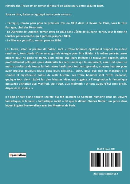 Histoire des Treize est un roman d'Honoré de Balzac paru entre 1833 et 1839. Sous ce titre, Balzac a regroupé trois courts romans : - Ferragus, roman paru pour la première fois en 1833 dans La Revue de Paris, sous le titre Ferragus, chef des Dévorants. - La Duchesse de Langeais, roman paru en 1833 dans L'Écho de la Jeune France, sous le titre Ne touchez pas à la hache, qu'il gardera jusqu'en 1839. - La Fille aux yeux d'or, roman paru en 1834. Les Treize, selon la préface de Balzac, sont « treize hommes également frappés du même sentiment, tous doués d'une assez grande énergie pour être fidèles à la même pensée, assez probes pour ne point se trahir, alors même que leurs intérêts se trouvaient opposés, assez profondément politiques pour dissimuler les liens sacrés qui les unissaient, assez forts pour se mettre au-dessus de toutes les lois, assez hardis pour tout entreprendre, et assez heureux pour avoir presque toujours réussi dans leurs desseins... Enfin, pour que rien ne manquât à la sombre et mystérieuse poésie de cette histoire, ces treize hommes sont restés inconnus, quoique tous aient réalisé les plus bizarres idées que suggère à l'imagination la fantastique puissance attribuée aux Manfred, aux Faust, aux Melmoth ; et tous aujourd'hui sont brisés, dispersés du moins. » Il s'agit en fait d'une société secrète qui fait basculer La Comédie humaine dans un univers fantastique, le fameux « fantastique social » tel que le définit Charles Nodier, un genre dans lequel Eugène Sue excellera avec Les Mystères de Paris.