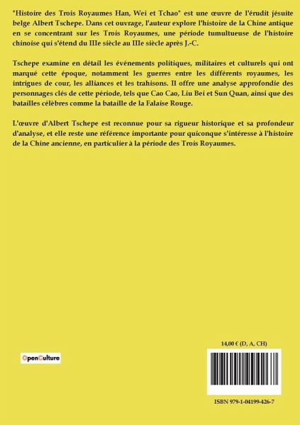 "Histoire des Trois Royaumes Han, Wei et Tchao" est une ¿uvre de l'érudit jésuite belge Albert Tschepe. Dans cet ouvrage, l'auteur explore l'histoire de la Chine antique en se concentrant sur les Trois Royaumes, une période tumultueuse de l'histoire chinoise qui s'étend du IIIe siècle au IIIe siècle après J.-C. Tschepe examine en détail les événements politiques, militaires et culturels qui ont marqué cette époque, notamment les guerres entre les différents royaumes, les intrigues de cour, les alliances et les trahisons. Il offre une analyse approfondie des personnages clés de cette période, tels que Cao Cao, Liu Bei et Sun Quan, ainsi que des batailles célèbres comme la bataille de la Falaise Rouge. L'¿uvre d'Albert Tschepe est reconnue pour sa rigueur historique et sa profondeur d'analyse, et elle reste une référence importante pour quiconque s'intéresse à l'histoire de la Chine ancienne, en particulier à la période des Trois Royaumes.