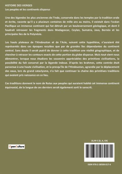 HISTOIRE DES VIERGES Les peuples et les continents disparus Une des légendes les plus anciennes de l¿Inde, conservée dans les temples par la tradition orale et écrite, raconte qüil y a plusieurs centaines de mille ans au moins, il existait dans l¿océan Pacifique un immense continent qui fut détruit par un bouleversement géologique, et dont il faudrait retrouver les fragments dans Madagascar, Ceylan, Sumatra, Java, Bornéo et les principales îles de la Polynésie. Les hauts plateaux de l¿Hindoustan et de l¿Asie, suivant cette hypothèse, n¿auraient été représentés dans ces époques reculées que par de grandes îles dépendantes du continent central. Sans doute il serait puéril de donner à cette tradition une réalité géographique, et de chercher à retracer les contours exacts de cette portion du globe disparue. Mais tout vient nous démontrer, lorsque nous étudions les souvenirs appréciables des primitives civilisations, la possibilité du fait conservé par la légende indoue. D¿après les brahmes, cette contrée était parvenue à une haute civilisation, et la presqüîle de l¿Hindoustan, agrandie par le déplacement des eaux, lors du grand cataclysme, n¿a fait que continuer la chaîne des primitives traditions qui avaient pris naissance en ce lieu. Ces traditions donnent le nom de Rutas aux peuples qui auraient habité cet immense continent équinoxial, de la langue de ces derniers serait également sorti le sanscrit.