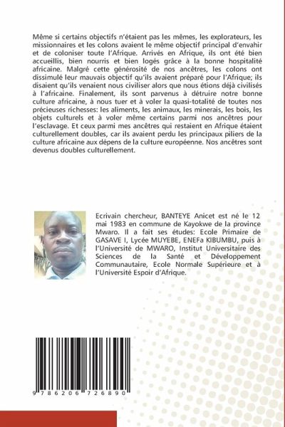 Même si certains objectifs n'étaient pas les mêmes, les explorateurs, les missionnaires et les colons avaient le même objectif principal d'envahir et de coloniser toute l'Afrique. Arrivés en Afrique, ils ont été bien accueillis, bien nourris et bien logés grâce à la bonne hospitalité africaine. Malgré cette générosité de nos ancêtres, les colons ont dissimulé leur mauvais objectif qu'ils avaient préparé pour l'Afrique; ils disaient qu'ils venaient nous civiliser alors que nous étions déjà civilisés à l'africaine. Finalement, ils sont parvenus à détruire notre bonne culture africaine, à nous tuer et à voler la quasi-totalité de toutes nos précieuses richesses: les aliments, les animaux, les minerais, les bois, les objets culturels et à voler même certains parmi nos ancêtres pour l'esclavage. Et ceux parmi mes ancêtres qui restaient en Afrique étaient culturellement doubles, car ils avaient perdu les principaux piliers de la culture africaine aux dépens de la culture européenne. Nos ancêtres sont devenus doubles culturellement.