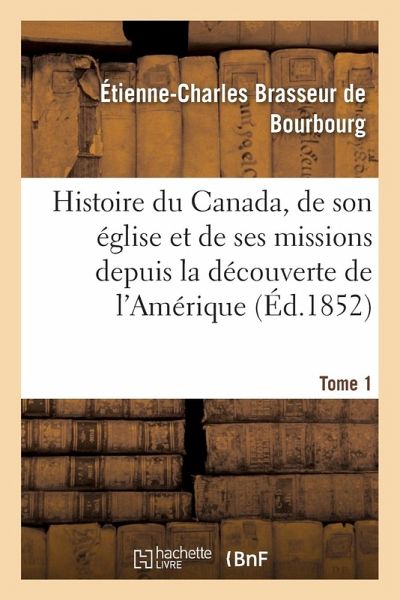 Histoire du Canada, de son église et de ses missions, depuis la découverte de l'Amérique jusqu'à nos jours: écrite sur des documents inédits compulsés dans les archives de l'archevêché et de la ville du Québec, etc.. Tome 1 / par M. l'abbé Brasseur de Bourbourg, ... Date de l'édition originale: 1852 Sujet de l'ouvrage: Canada -- Histoire Le présent ouvrage s'inscrit dans une politique de conservation patrimoniale des ouvrages de la littérature Française mise en place avec la BNF. HACHETTE LIVRE et la BNF proposent ainsi un catalogue de titres indisponibles, la BNF ayant numérisé ces oeuvres et HACHETTE LIVRE les imprimant à la demande. Certains de ces ouvrages reflètent des courants de pensée caractéristiques de leur époque, mais qui seraient aujourd'hui jugés condamnables. Ils n'en appartiennent pas moins à l'histoire des idées en France et sont susceptibles de présenter un intérêt scientifique ou historique. Le sens de notre démarche éditoriale consiste ainsi à permettre l'accès à ces oeuvres sans pour autant que nous en cautionnions en aucune façon le contenu. Pour plus d'informations, rendez-vous sur www.hachettebnf.fr