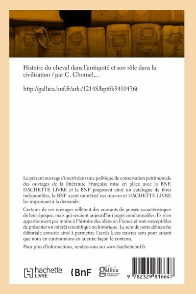 Histoire du cheval dans l'antiquité et son rôle dans la civilisation / par C. Chomel, ... Date de l'édition originale: 1900 Le présent ouvrage s'inscrit dans une politique de conservation patrimoniale des ouvrages de la littérature Française mise en place avec la BNF. HACHETTE LIVRE et la BNF proposent ainsi un catalogue de titres indisponibles, la BNF ayant numérisé ces oeuvres et HACHETTE LIVRE les imprimant à la demande. Certains de ces ouvrages reflètent des courants de pensée caractéristiques de leur époque, mais qui seraient aujourd'hui jugés condamnables. Ils n'en appartiennent pas moins à l'histoire des idées en France et sont susceptibles de présenter un intérêt scientifique ou historique. Le sens de notre démarche éditoriale consiste ainsi à permettre l'accès à ces oeuvres sans pour autant que nous en cautionnions en aucune façon le contenu. Pour plus d'informations, rendez-vous sur www.hachettebnf.fr