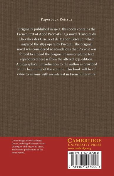 Originally published in 1942, this book contains the French text of Abbé Prévost's 1731 novel Histoire du Chevalier des Grieux et de Manon Lescaut, which inspired the 1893 opera by Puccini. The original novel was considered so scandalous that Prévost was forced to amend the original manuscript; the text reproduced here is from the altered 1753 edition. A biographical introduction to the author is provided at the beginning of the volume. This book will be of value to anyone with an interest in French literature.