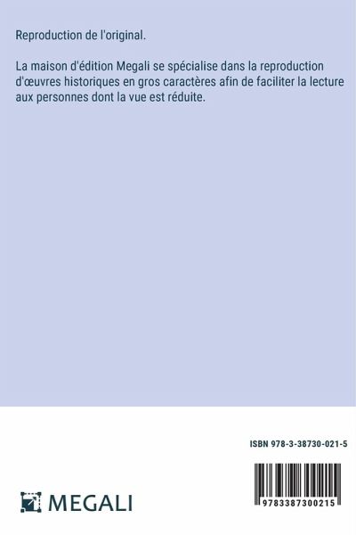 Reproduction de l'original. La maison d'édition Megali se spécialise dans la reproduction d'¿uvres historiques en gros caractères afin de faciliter la lecture aux personnes dont la vue est réduite.