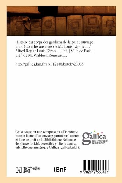 Histoire du corps des gardiens de la paix: ouvrage publie sous les auspices de M. Louis Lepine, ... / Alfred Rey et Louis Feron, ...; [ed.] Ville de Paris; pref. de M. Waldeck-Rousseau, ...Date de l'edition originale: 1896Sujet de l'ouvrage: Police -- France -- HistoireCe livre est la reproduction fidele d'une oeuvre publiee avant 1920 et fait partie d'une collection de livres reimprimes a la demande editee par Hachette Livre, dans le cadre d'un partenariat avec la Bibliotheque nationale de France, offrant l'opportunite d'acceder a des ouvrages anciens et souvent rares issus des fonds patrimoniaux de la BnF.Les oeuvres faisant partie de cette collection ont ete numerisees par la BnF et sont presentes sur Gallica, sa bibliotheque numerique.En entreprenant de redonner vie a ces ouvrages au travers d'une collection de livres reimprimes a la demande, nous leur donnons la possibilite de rencontrer un public elargi et participons a la transmission de connaissances et de savoirs parfois difficilement accessibles.Nous avons cherche a concilier la reproduction fidele d'un livre ancien a partir de sa version numerisee avec le souci d'un confort de lecture optimal. Nous esperons que les ouvrages de cette nouvelle collection vous apporteront entiere satisfaction.Pour plus d'informations, rendez-vous sur www.hachettebnf.frhttp: //gallica.bnf.fr/ark: /12148/bpt6k923035