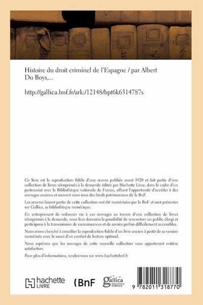 Histoire du droit criminel de l'Espagne / par Albert Du Boys, ... Date de l'édition originale: 1870 Le présent ouvrage s'inscrit dans une politique de conservation patrimoniale des ouvrages de la littérature Française mise en place avec la BNF. HACHETTE LIVRE et la BNF proposent ainsi un catalogue de titres indisponibles, la BNF ayant numérisé ces oeuvres et HACHETTE LIVRE les imprimant à la demande. Certains de ces ouvrages reflètent des courants de pensée caractéristiques de leur époque, mais qui seraient aujourd'hui jugés condamnables. Ils n'en appartiennent pas moins à l'histoire des idées en France et sont susceptibles de présenter un intérêt scientifique ou historique. Le sens de notre démarche éditoriale consiste ainsi à permettre l'accès à ces oeuvres sans pour autant que nous en cautionnions en aucune façon le contenu. Pour plus d'informations, rendez-vous sur www.hachettebnf.fr