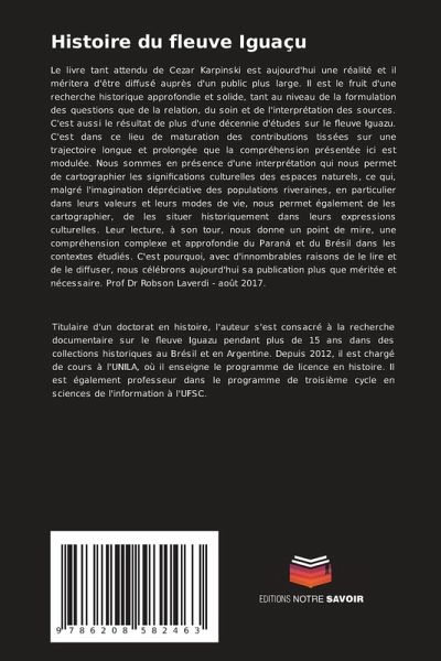 Le livre tant attendu de Cezar Karpinski est aujourd'hui une réalité et il méritera d'être diffusé auprès d'un public plus large. Il est le fruit d'une recherche historique approfondie et solide, tant au niveau de la formulation des questions que de la relation, du soin et de l'interprétation des sources. C'est aussi le résultat de plus d'une décennie d'études sur le fleuve Iguazu. C'est dans ce lieu de maturation des contributions tissées sur une trajectoire longue et prolongée que la compréhension présentée ici est modulée. Nous sommes en présence d'une interprétation qui nous permet de cartographier les significations culturelles des espaces naturels, ce qui, malgré l'imagination dépréciative des populations riveraines, en particulier dans leurs valeurs et leurs modes de vie, nous permet également de les cartographier, de les situer historiquement dans leurs expressions culturelles. Leur lecture, à son tour, nous donne un point de mire, une compréhension complexe et approfondie du Paraná et du Brésil dans les contextes étudiés. C'est pourquoi, avec d'innombrables raisons de le lire et de le diffuser, nous célébrons aujourd'hui sa publication plus que méritée et nécessaire. Prof Dr Robson Laverdi - août 2017.