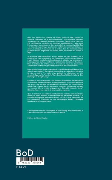 SECONDE EDITION : Index corrigé.Dans son histoire des Cahiers du cinéma parue en 1991, Antoine de Baecque constatait, à propos du mac-mahonisme : "une littérature sûrement trop pauvre par rapport à l'influence du groupe". Depuis trente ans, cette carence a été partiellement comblée par plusieurs autobiographies mais aucun livre sur le mouvement dans sa totalité n'a été publié. Le fait est d'autant plus étrange que le mac-mahonisme continue d'infuser le débat, la critique et la pensée sur le cinéma. Ces dix dernières années, plusieurs revues originaires des quatre coins du monde ont abordé le sujet. A un niveau plus superficiel, un des signes les plus éclatants de la postérité du mac-mahonisme est l'abondance d'idées reçues, plus ou moins fondées en réalité, qui continuent de circuler sur son compte : intransigeance puriste, snobisme réactionnaire, tendances fascistes...Dans la critique de cinéma, aucun mouvement n'aura eu d'aura aussi durablement sulfureuse ; pour de bonnes et de mauvaises raisons.Mais qu'est-ce que le mac-mahonisme ? La fréquentation intensive de la salle du Mac-Mahon ? Une théorie du septième art qui prône le primat de la mise en scène ? Le culte d'une poignée de réalisateurs en tête desquels figurerait le "carré d'as" formé par Raoul Walsh, Fritz Lang, Otto Preminger et Joseph Losey ? Raconter le mac-mahonisme, c'est raconter notamment: les tribulations d'une bande d'amis cinéphiles, la programmation d'une salle unique en son genre, un courant de pensée étudié aujourd'hui à l'université, les guerres de chapelles critiques au tournant des années 60, la restée embryonnaire "Nouvelle Nouvelle Vague", l'histoire d'une revue à partir de son neuvième numéro...Quoi de commun, au-delà des éventuels liens d'amitié, entre l'activisme mené par Pierre Rissient, la théorie formulée par Michel Mourlet et le périodique dirigé par Jacques Lourcelles ? C'est ce que, s'appuyant sur des documents d'archives et des témoignages inédits, Christophe Fouchet a tenté de déterminer.
