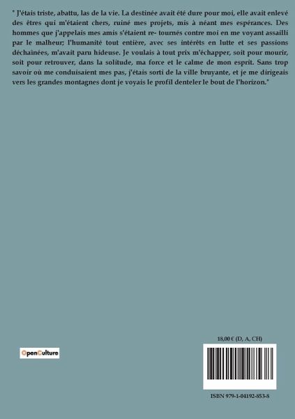 " J'étais triste, abattu, las de la vie. La destinée avait été dure pour moi, elle avait enlevé des êtres qui m'étaient chers, ruiné mes projets, mis à néant mes espérances. Des hommes que j'appelais mes amis s'étaient re- tournés contre moi en me voyant assailli par le malheur; l'humanité tout entière, avec ses intérêts en lutte et ses passions déchaînées, m'avait paru hideuse. Je voulais à tout prix m'échapper, soit pour mourir, soit pour retrouver, dans la solitude, ma force et le calme de mon esprit. Sans trop savoir où me conduisaient mes pas, j'étais sorti de la ville bruyante, et je me dirigeais vers les grandes montagnes dont je voyais le profil denteler le bout de l'horizon."