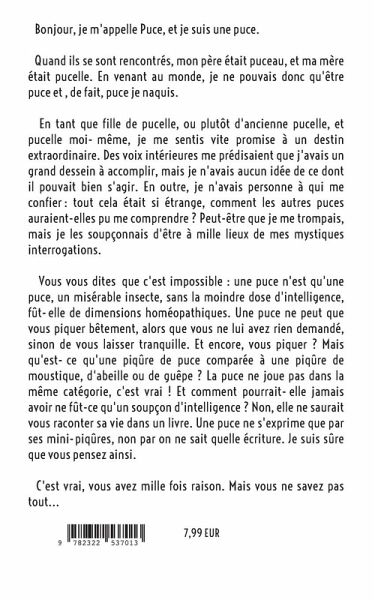 Bonjour, Je m'appelle Puce, et je suis une puce. Quand ils se sont rencontrés, mon père était puceau, et ma mère était pucelle. En venant au monde, je ne pouvais donc qu'être puce et , de fait, puce je naquis. En tant que fille de pucelle, ou plutôt d'ancienne pucelle, et pucelle moi-même, je me sentis vite promise à un destin extraordinaire. Des voix intérieures me prédisaient que j'avais un grand dessein à accomplir, mais je n'avais aucun idée de ce dont il pouvait bien s'agir. En outre, je n'avais personne à qui me confier : tout cela était si étrange, comment les autres puces auraient-elles pu me comprendre ? Peut-être que je me trompais, mais je les soupçonnais d'être à mille lieux de mes mystiques interrogations. Vous vous dites que c'est impossible : une puce n'est qu'une puce, un misérable insecte, sans la moindre dose d'intelligence, fût-elle de dimensions homéopathiques. Une puce ne peut que vous piquer bêtement, alors que vous ne lui avez rien demandé, sinon de vous laisser tranquille. Et encore, vous piquer ? Mais qu'est-ce qu'une piqûre de puce comparée à une piqûre de moustique, d'abeille ou de guêpe ? La puce ne joue pas dans la même catégorie, c'est vrai ! Et comment pourrait-elle jamais avoir ne fût-ce qu'un soupçon d'intelligence ? Non, elle ne saurait vous raconter sa vie dans un livre. Une puce ne s'exprime que par ses mini-piqûres, non par on ne sait quelle écriture. Je suis sûre que vous pensez ainsi. C'est vrai, vous avez mille fois raisons. Mais vous ne savez pas tout.