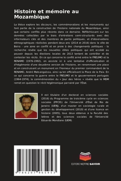 La thèse explore les discours, les commémorations et les monuments qui font partie de la construction de l'histoire nationale du Mozambique, ainsi que certains conflits plus récents dans ce domaine. Réfléchissant sur les données collectées par le biais d'entretiens semi-structurés avec des informateurs clés et des membres de partis politiques, et d'observations ethnographiques réalisées pendant deux ans (2014 et 2016) dans la ville de Beira - une zone en conflit et en proie à des changements politiques - la recherche révèle que les nouvelles élites politiques qui ont accédé au pouvoir depuis les élections locales de 2013 tentent de contrôler et de contester les récits. En ce qui concerne le conflit armé entre le FRELIMO et la RENAMO (1976-1992), on assiste ici à une tentative d'officialisation et d'hégémonie d'une deuxième version de l'histoire, en renommant une place et en construisant un monument en l'honneur du premier commandant de la RENAMO, André Matsangaíssa, ainsi qu'en officialisant la Place de la Paix. En ce qui concerne la guerre entre le FRELIMO et le gouvernement portugais (1964-1974), la commémoration du « Jour des héros » révèle que le MDM remet en question le récit hégémonique parrainé par l'État.
